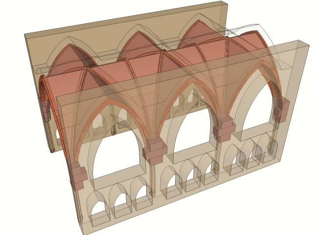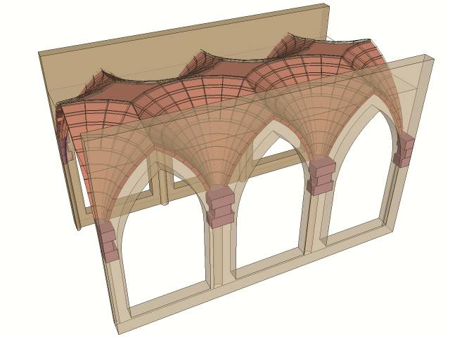 The diagrams above show three typical types of vault construction used in Gothic architecture. The first is a semi-circular vault, often used in the side-aisles of the first (Norman period) cathedrals from the late 11th to the late 12th Centuries. The second is a pointed vault, which took over from the semi-circular vault from the mid-12th Century onwards, and became the 'typical' Gothic vault construction (in the central spaces as well as side-aisles of cathedrals) until the end of the Gothic era at the beginning of the 16th Century. The third is a fan vault - a structurally much more sophisticated type of construction from the other two, and in occasional use from the late 14th Century.